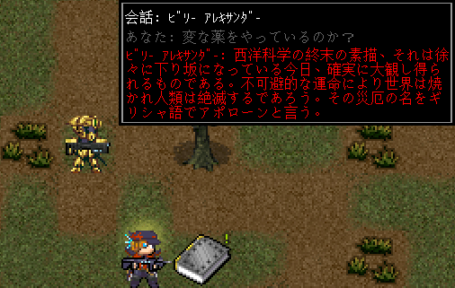 こいつは友好的なNPCなので気軽に話しかけてみようぜ。なにか用事でもあるのかと聞いたところ、変なことを語り始めやがった。奴の話によると『未来に絶望するような終末』が近づいて来ているんだってさ。そんなこと言われなくたって今のニューイングランドは誰が見ても絶望するような終末でしょう。