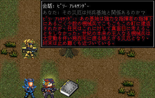 まあいいや、とりあえずは2人で黄色いNPCから話を聞こうぜ。俺から奪った武装はあとで絶対に返却してもらうから覚えておけよな。黄色いNPCに災厄や終末が州兵基地と関係あるのか問いただしたところ、どうやら災厄は州兵基地を闊歩している機械兵が起こしたものらしい。機械兵と大変動のせいで州兵基地が終末に至る災厄へと変貌したのだ。