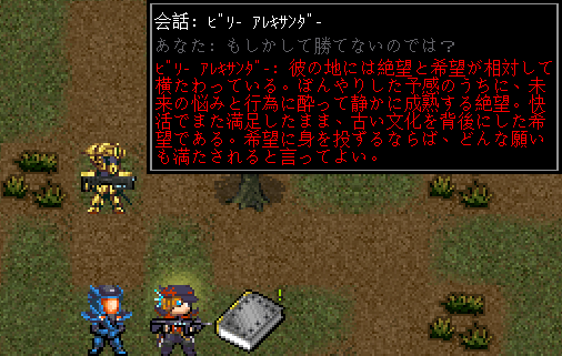 それでは双方向無線機を使用して青い戦闘スーツのNPCを呼び出します。数ターン後にはノコノコと長距離テレポートで姿を現すに違いない。現在地の平野は救急車から離れているから全力を出しても車両に被害は及びません。最強クラスのCBMを連発しても問題は無いのである。下克上だぜー!つーぶーせー!