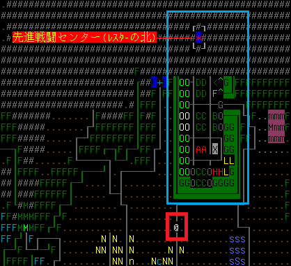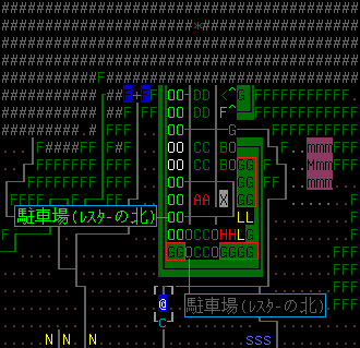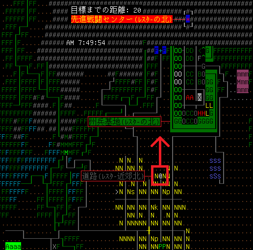 落ち着いてベストの行動を考えよう。おそらく赤い四角で囲んだ『G』は森林なのだ。州兵基地の内部には森林がありロボットが潜んでいるのです。このまま北上して森林から侵入するのは自殺行為だ。しかし、他の場所、たとえば駐車場などから入っても森林にいるロボットに狙撃されてしまう。