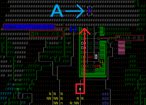 俺が考えた作戦を発表しよう。まずは普通に北上して基地の中に侵入する。そして基地の中で無双しながら目的地に向かうのがベストだと判断しました(赤い矢印の経路)。ろくな作戦じゃないように思えるけど、他の経路は無理があるのです。たとえば『A』という地点から右に進めば最小限の戦闘で済むような気がする(青い矢印の経路)。だが、Aの周辺には森林があるので視界が悪い状況でロボットとゲリラ戦をすることになるのだ。視界が悪いとレーザースナイパーの射程を活かせないから必敗するだろう。同様に州兵基地の右側にある『門』からの侵入も周囲に森林があるため危険だ。
