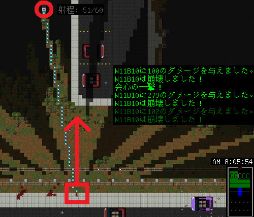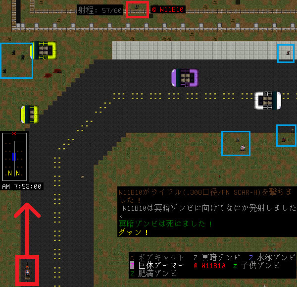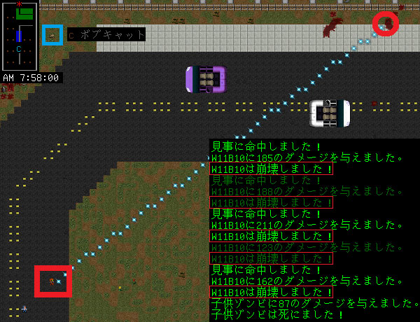 現在の戦場は上の画像。ゴチャゴチャしていて分かりにくいけど、画面上の赤い四角の場所に軍事ロボットがいます。青い四角の場所には雑魚ゾンビがいるのだ。