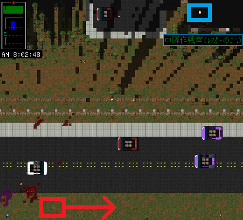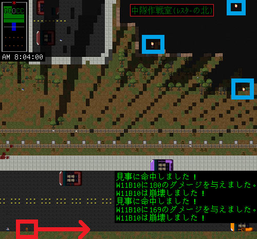 だけど中隊作戦室の中にはロボットがいるんだよな。中隊作戦室から安全に基地へ侵入する計画が破綻したかあ?なんとかして中隊作戦室の中にいるロボットを倒したいと近づいてみたら新手のロボットを感知しました(青い四角の場所)。それと道路に2体のロボットが出現したので討伐しておいた。