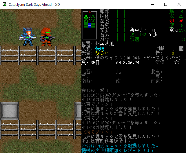 2カ所の有刺鉄条網を越えて、ようやく州兵基地の内部に入ることができた。今回のプレイ日記はここで中断します。視界の中に敵はいないし、このあたりで一息つきましょう。電気受容器官の範囲内に新手のロボットが出現したけどなあ。