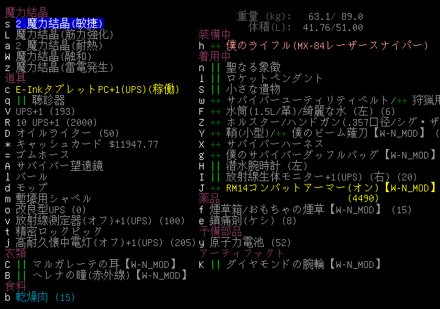 現在の所持品と装備品は上の画像。今回の投稿では10体の軍事ロボットと雑魚ゾンビの大群を葬りました。UPS電力の消費はたったの1900なのである。ロボットの出現率は高いけど地域運営学校の子供ゾンビほどではない。