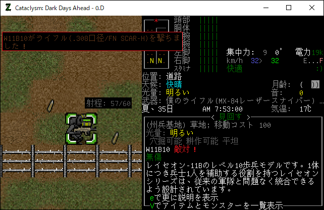W11B10の説明文は上の画像。さっきから雑魚ゾンビに.308口径のライフルを撃ちまくっていやがる。W11B10の射程はたぶん60タイル。そして奴との距離は57タイルなので俺が狙撃されてもおかしくはない。逃げる余裕すらありません。W11B10に向かってレーザースナイパーをぶっ放すぞ!