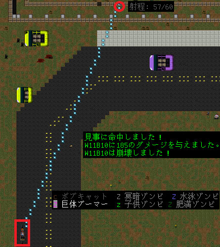 先ほど考えた作戦通りゾンビを討伐しながらジワジワと北上します。すると2体目のW11B10が現れやがった(射程59)。ほんの3タイル歩いただけで新手のロボットが生成されたのだ。ロボットの出現率が高すぎてヤバイって!