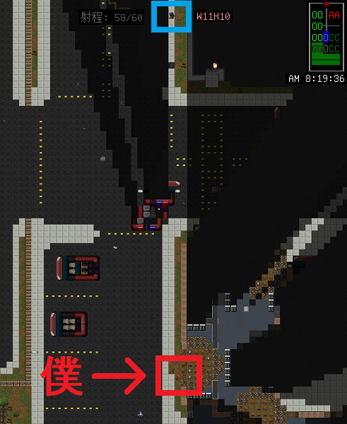 北側の射程58の位置にW11H10が出現したようです。たぶん初遭遇のロボットだと思われる。今まで討伐してきたロボットはW11『B』10だからな。