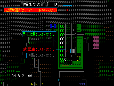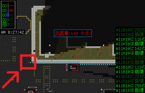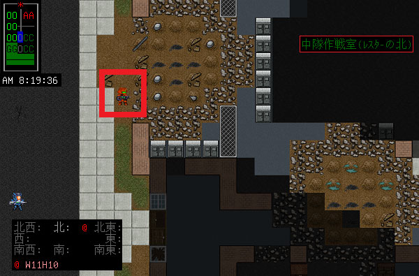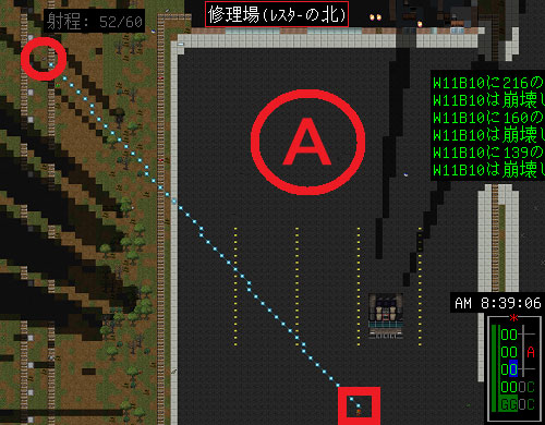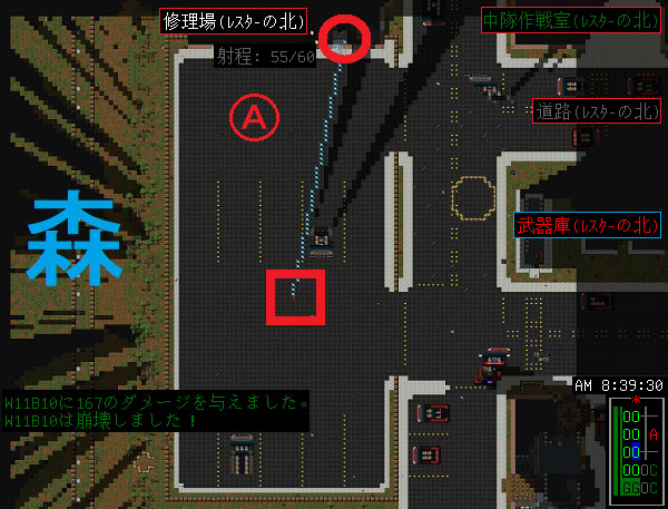 兎にも角にも、以上の戦闘により武器庫の南側(下側)を徘徊していたロボットは全滅した。敏捷の秘術で加速しているうちに北上しましょう。上の画像の『A』という場所へ行くことにします。Aの位置なら北側の施設『修理場、中隊作戦室、道路』のロボットを狙撃し放題になる。