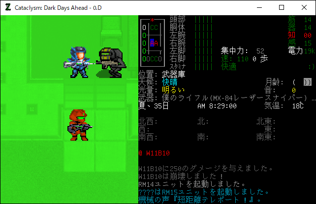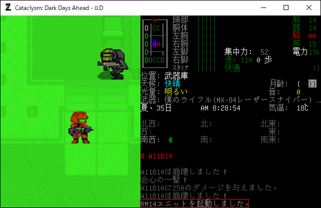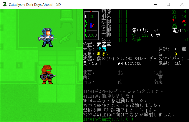 Cataclysmのプレイ日記を始めます。州兵基地にいるロボットを27体ほど破壊しました。ロボットとの戦闘が大変で目的地へ近づくことができません。こんな亀さんみたいなペースでノコノコと進軍していたら、いつまで経っても先進戦闘センターに到着しないぞ。