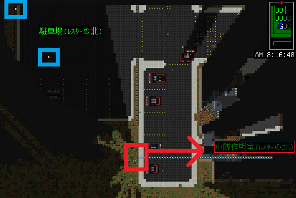 中隊作戦室に寄り道したせいで頭が混乱してきた。周辺の施設を観察しながら侵攻ルートについて考えます。現在地から少し北側(上側)に向かうと道路がある。さらに北へ進むと武器庫があります。