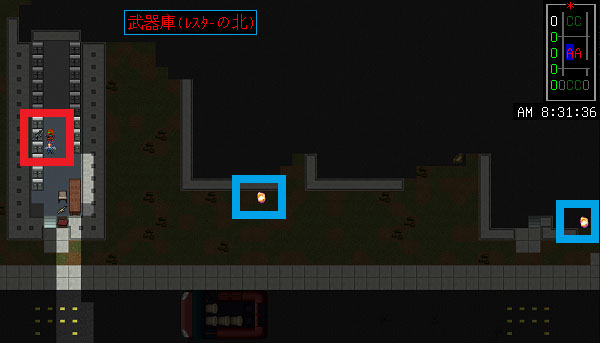 武器庫に到着したときの俺は上の画像。武器庫の入口は施錠された金属シャッターなので中にはいることができません。つーか、電気受容器官の感知により武器庫の中にはロボットが徘徊していると判明した。これじゃあ入口のシャッターを開けた瞬間にぶっ殺される。