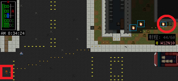 どうせ銃器を拾っても使わないだろう。武器庫なんて無視すれば良かったのだ。時間をロスしたのでロボットが近づいてきやがった(青い四角の場所)。画像には表示されていないけど上の方からも敵が来ています。ロボットとの距離は射程20以内と近すぎるので殺されるかもしれない。