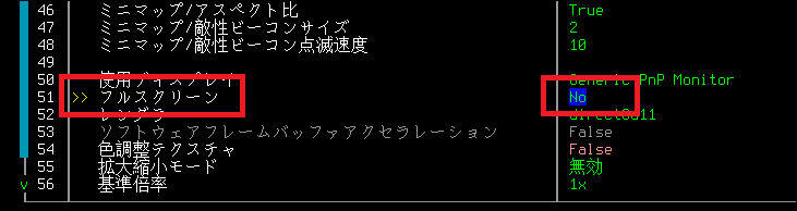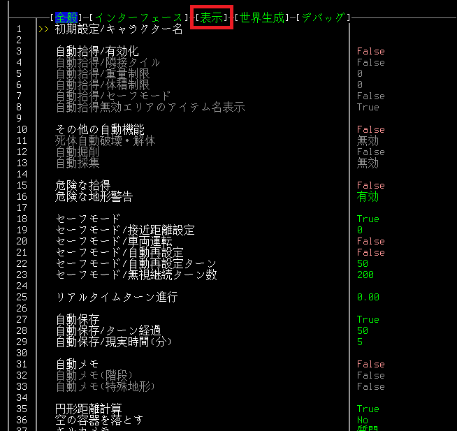 上の画像がオプションの設定画面になります。「tabキー」を連打して「表示」の設定を開きます。