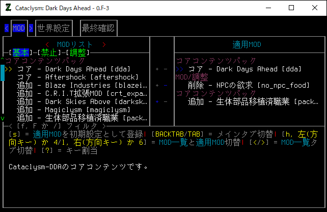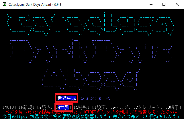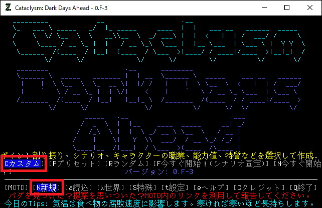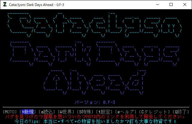今回から「Cataclysm Dark Days Ahead 0.F-3安定版」のプレイ日記を書きます。次のシナリオが最後のCDDAプレイ日記になります。私は0.D安定版を3年以上プレイしていました。現在の環境が全くわかりません。今回は0.F-3安定版のインストールだけを行います。しばらくは試行錯誤を繰り返して後日わかりやすくまとめた投稿を作ります。2/5追記。これから14回ほど地味な試行錯誤の投稿が続きます。地味な投稿を飛ばしてプレイ日記の直前に飛びたい方はこちら。