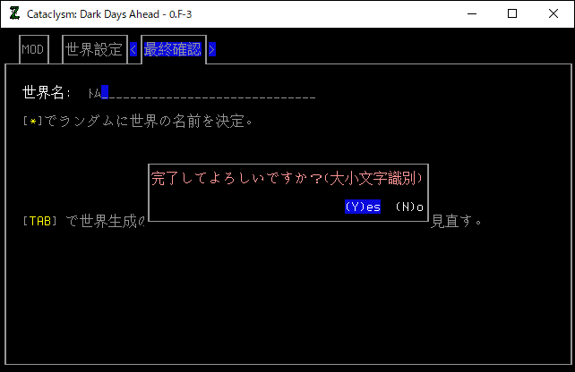 MODについては後日、説明します。正直に言うと説明できるほど知識が無いし、そもそもMODを持っていないのです(笑)。「Tabキー」を連打してデフォルト設定のまま「トム」という世界を作りました。