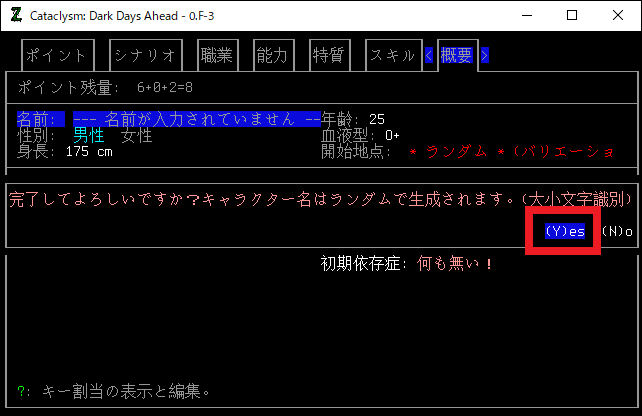 このブログ記事はゲームのインストールが目的ですから、プレイキャラクターは適当に作ります。Tabキーを連打しまくってデフォルトのキャラクターが完成しました。ここでYesを選択するとゲームが開始するのです。