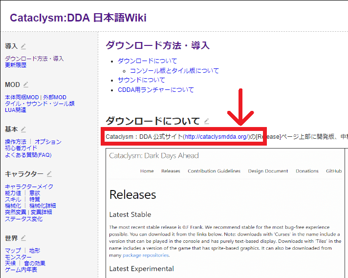 それでは0.F-3安定版をインストールしましょう。まずは「Cataclysm:DDA 日本語Wiki」のページを開きます。そして左上の「ダウンロード方法・導入」をクリックします。