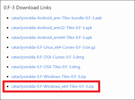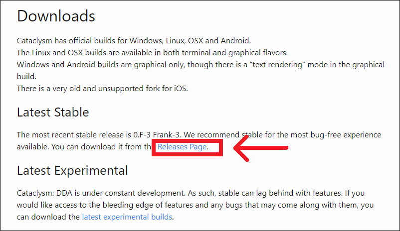 「ダウンロード方法・導入」のページには安定版だけでなく、様々なバージョンのリンク先が記載されています。今回は0.F-3安定版をダウンロードするのでCataclysm:DDAの公式サイトのURLをクリックしましょう。wikiを開かなくてもアクセスできるように公式サイトのURLを貼っておきます。