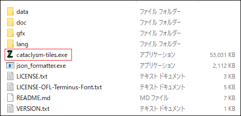 ダウンロードをしたzipを解凍すると、作成されたフォルダが上の画像のようになると思います。「cataclysm-tiles.exe」をダブルクリックしてください。俺のパソコンはタッチパネルではないからマウスでクリックしています(笑)。