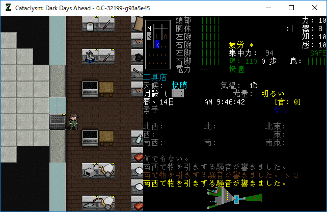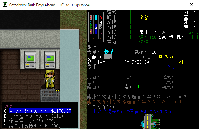 Cataclysmのプレイ日記を始めます。前回は銀行の金庫破りをしました。今回は『はんだ』や『はんだごて』の入手を目標に街を駆け回ります。