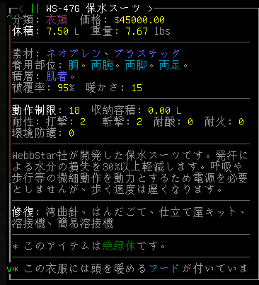 銀行から手に入れたアイテムを観察しよう。保水スーツは優秀な装備だろう。だけど動作制限が18と高いし歩く速度が下がります。