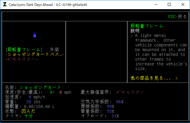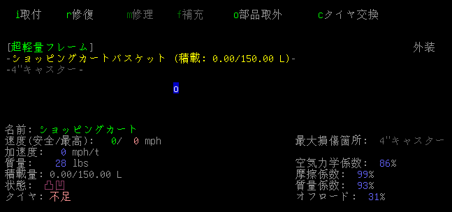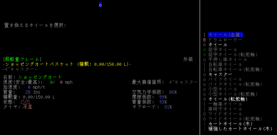 この状態で運搬用のカートを調べる『e』。なんとタイヤが直っています!どうしてこうなった!?前回と何か違うことがあるのか・・・わかったぞお!?『4"キャスター=タイヤ』だったのだ!今回は交換用のキャスターを回収してきたからホイール交換の画面が表示されたんだ!