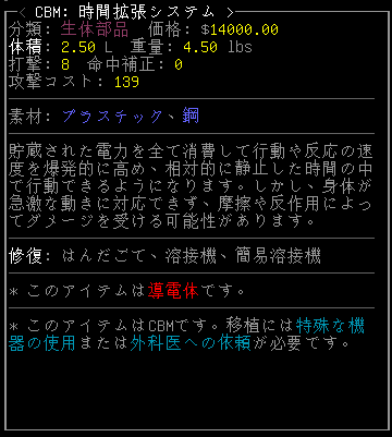 CBMを埋め込むには『麻酔キット』が必要らしいです(Cataclysmスレより)。もしくは外科医に頼むとかね。まだまだ重火器も扱えない素人だからCBMは放置します。