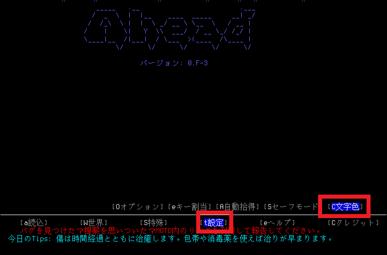 この読みづらい青文字は0.Dの時にも修正した。同じ方法で見やすくしてしまおう。タイトル画面で「設定」→「文字色」を選択します。