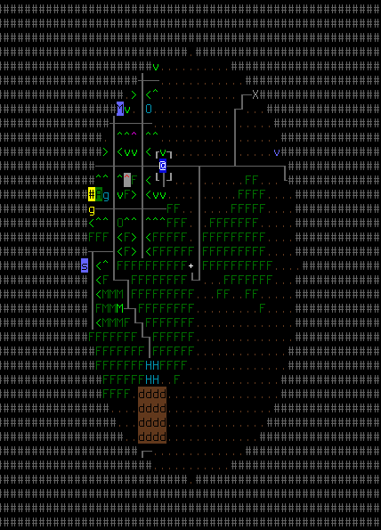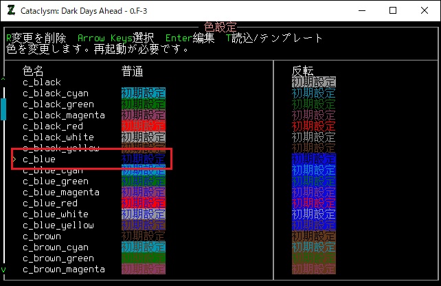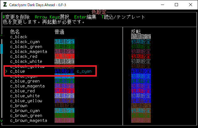 c_blueの文字色をc_cyanに変更しました。これをやるとゲーム内で表示されている、ありとあらゆるc_blueがc_cyanになってしまう。全体マップの記号などもc_cyanに変わります。ゲームへの影響が大きすぎるから、できることなら避けたい変更だった。再起動してセーブデータを読み込みます。