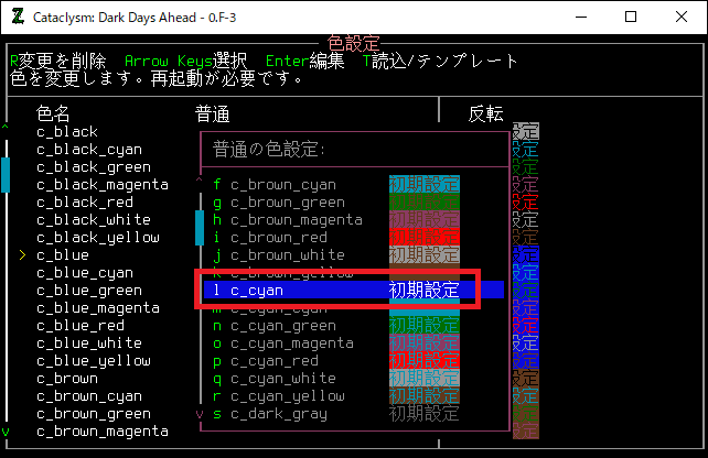 ここで0.Dのときと同じように「c_cyan」を選択します。この文字色の変更は溜まり場の書き込みで知りました。こういった重要な情報を知ることができるから、溜まり場の過去ログを読みまくろうとか、労力のかかる計画を立ててしまうんだよなあ。