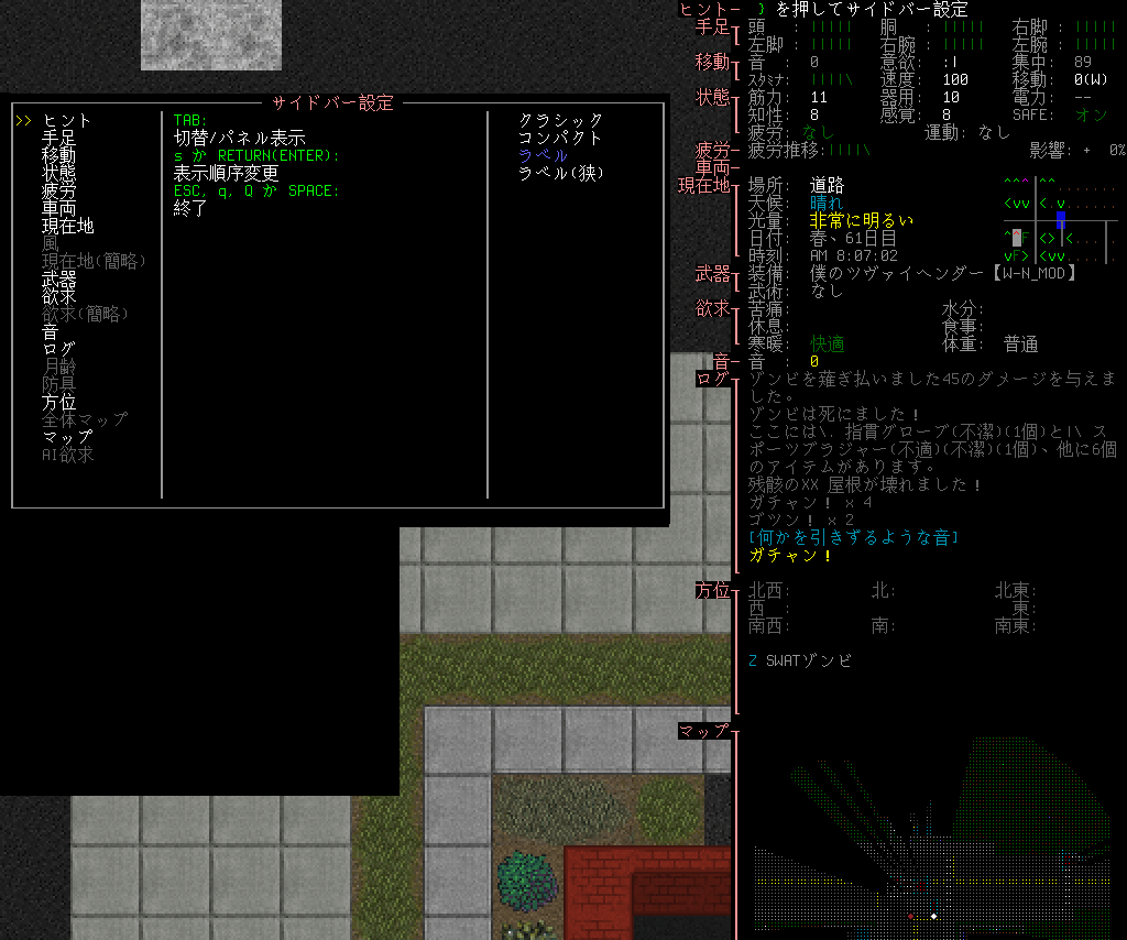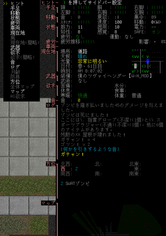 削除をしてしまったが「方位」は重要な項目だ。この小さな画面で現在の戦況、つまりゾンビの位置、名称、数を説明できる。状況によってはログよりも役に立ちます。いささか面倒ではあるが、戦闘中はログと方位のオン・オフを切り替えてしまおう。