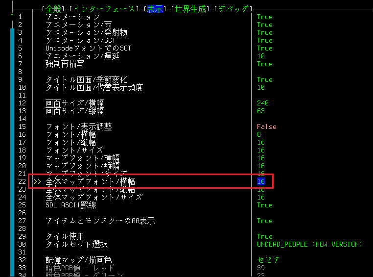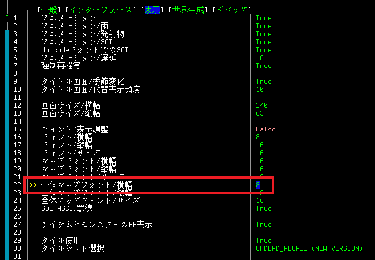 全体マップのフォントサイズはある程度、自由に変えることができる。0.Dのと同じものにするなら「全体マップフォント/横幅」を「16」から「8」に変更すればいい。これも数年前に溜まり場に書き込まれていたやり方なのだ。