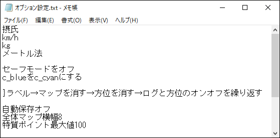 変更したオプション設定はメモ帳にまとめておきます。本番のときはこいつを参考にしよう。次回もオプション設定をやると思います。フォントの変更もやりたい。溜まり場の過去ログを2年分くらい読み返したくなってきた。これじゃあいつまでたってもゲームが始まらねえ!