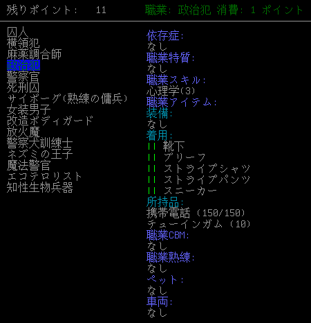「政治犯」は初期アイテムに「携帯電話」があります。職業スキルに「心理学」があるけど脱獄には役に立たないと思われる。