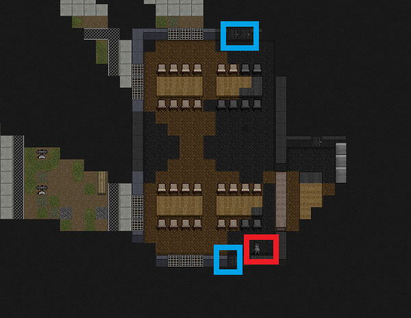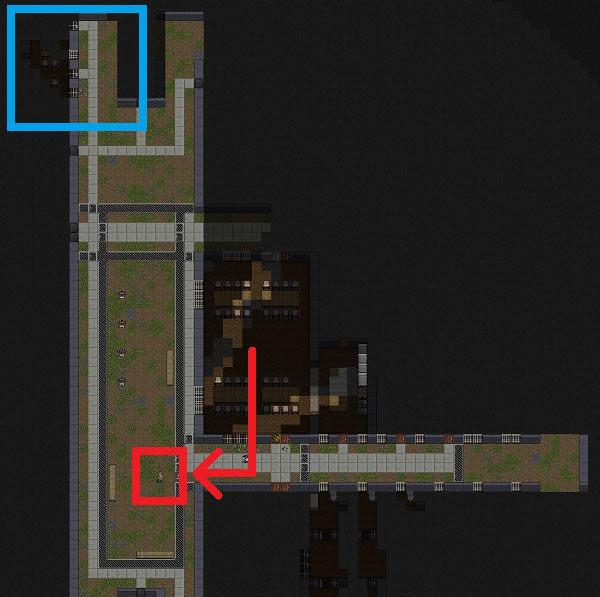 ゾンビから逃げつつ出口を探します。左上の青い四角で囲んだ場所に事務所のような部屋があります。あの事務所が出口かもしれないので近づいてみましょう。