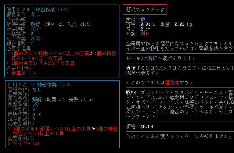 現在のMODだと簡易ロックピックのクラフトには2つのレシピがある。「金属屑」を材料にするものと、「ワイヤー」を材料にするものの2種類だ。いまのところは材料と道具を揃える方法がサッパリわからない。