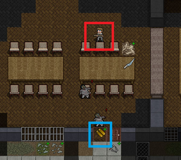 もう少し周囲の地形を広く見渡そう。赤い四角の場所にルパンがいます。青い四角の場所には木製のドアがある。この木製のドアに鍵が掛かっていなければ余裕で脱獄はできそうだ。