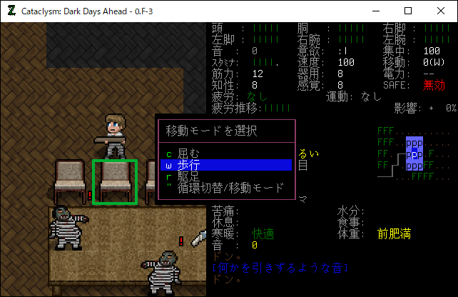 走ろうとして「"」を押したら移動モードの選択画面が表示されました。0.Dではこんな画面は出なかった!やべえ!ここで選択をミスったら死ぬぞ!「r駆足」を選べば走るんだよね。
