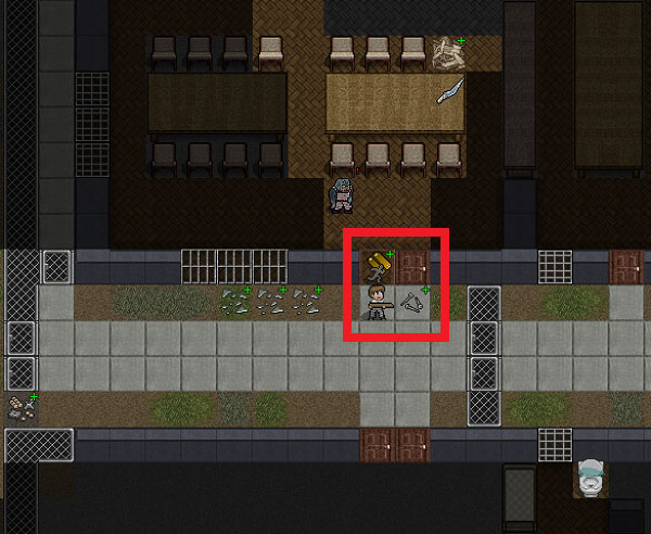 左上の事務所は出口ではないのかもしれない。刑務所の中を歩き回ってどんな部屋があるのか調べましょう。すると工具が置かれた部屋を発見しました。しかし、部屋の中にはゾンビがいるので簡単には入れない。工具の部屋には3~4体のゾンビがいるため、かなり上手く立ち回らないと殺されます。