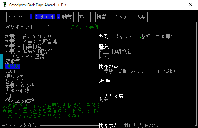 シナリオは「刑務所」を選択します。このシナリオは4ポイントも貰えるんだね。ちなみに避難シェルターから開始する「避難者」は0ポイント。高難易度の「最悪の日」は8ポイントです。