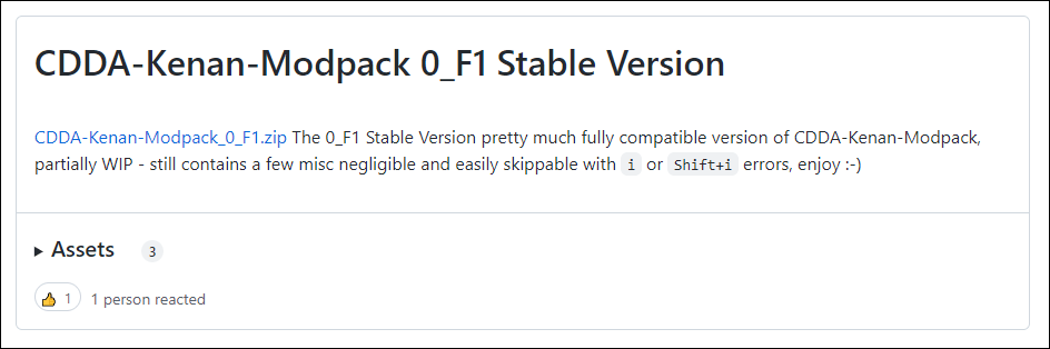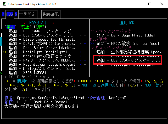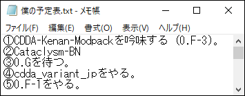 しかしながら「cdda_variant_jp」をやるなら「0.F-1」の方が楽に導入できそうだと思ってしまう。0.F-1には正式な「Kenan-Modpack」がありますからね。0.F-3よりもMODのエラーが少ないだろうし、RP重視ならこれを第一候補にするべきなんだよ。MODの動作確認をしなくて済みますしね。