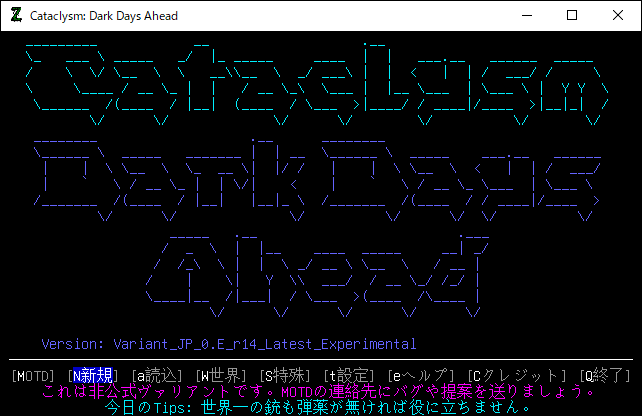 ぐだぐだ駄文を書いたけど、今回の投稿で紹介したい本命は「cdda_variant_jp」なのです。このバージョンは本当に羨ましくてね。皆さんがこれを遊んでいるときに、私は半泣きになりながらタロウ・タナカを操作してシコシコと家屋を漁っていたのです。Magiclysmすら無い0.Dで、誰も読まないであろうゲームの解説を書いていたのだ。