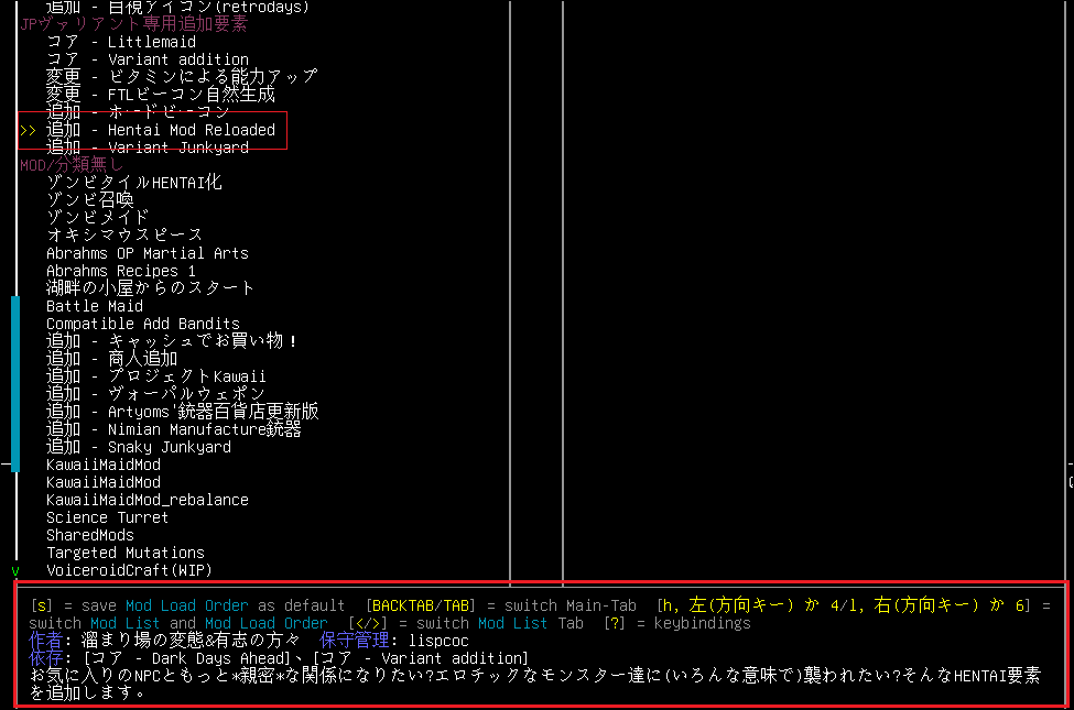 「cdda_variant_jp」には伝説の「Hentai Mod」があります。珍しいMODを楽しめるし「CDDA-Kenan-Modpack 0_E3」を無理やり導入すると、かなりパワーアップします。最後にプレイするバージョンとして、今となっては入手が困難であろう「cdda_variant_jp」を使うのもありかな。