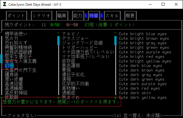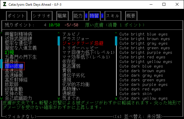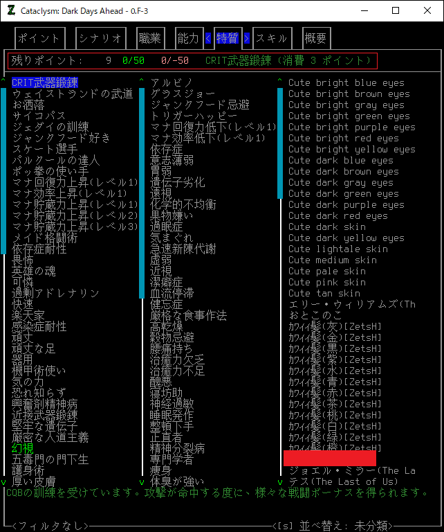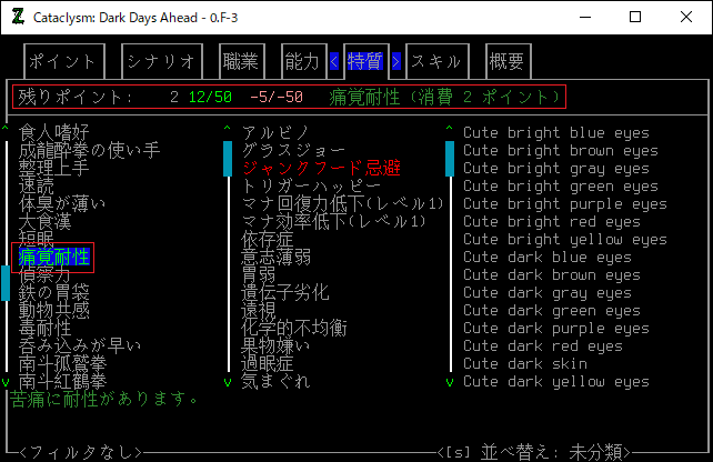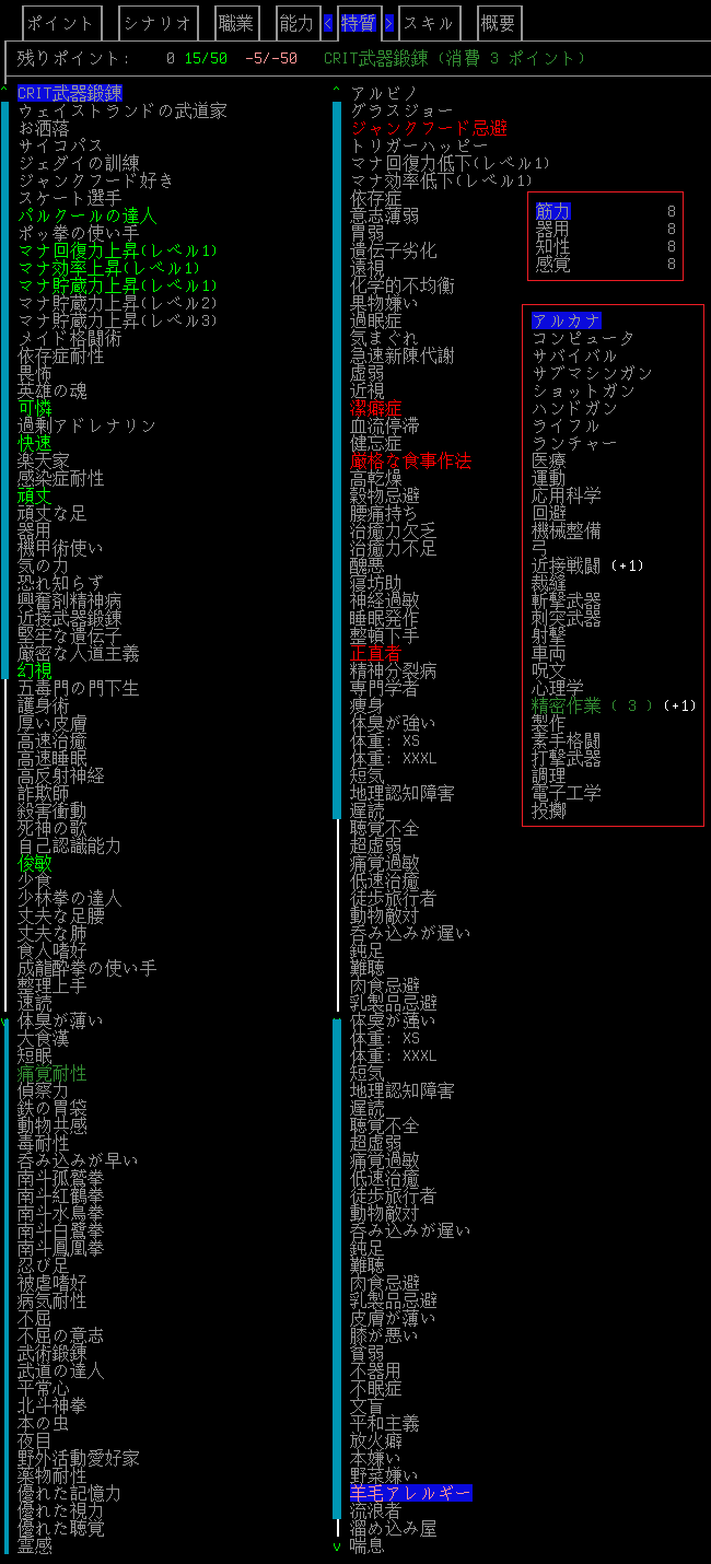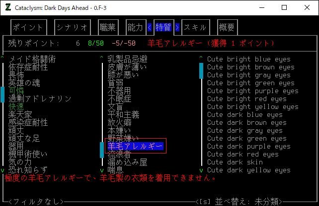 羊毛アレルギーはあんがい厳しい特質だ。過去のプレイ日記で羊毛製のアーティファクトを装備できなかったりした。まあ羊毛製の衣類をクラフトで布製に変えてしまえば解決します。以上で取得できそうな右側の特質は終わり。あとはデメリットが酷いので諦めます。
