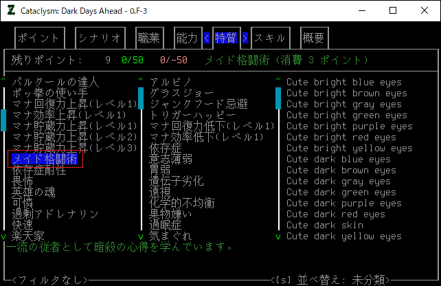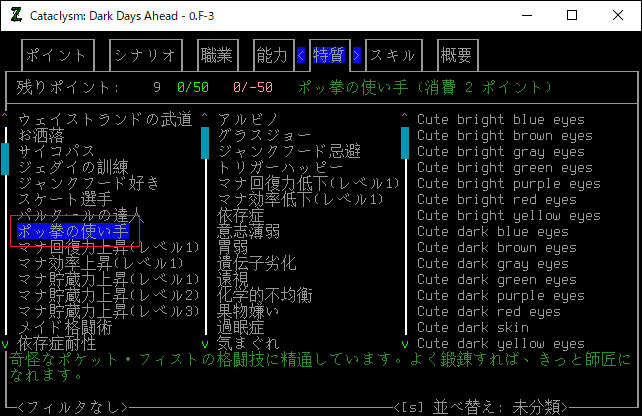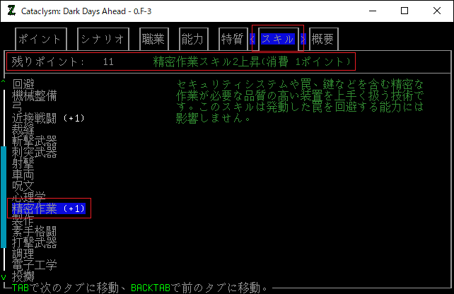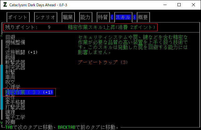 2ポイント消費して精密作業スキルを「3」にしました。職業スキルの補正で実際のスキル値は「4」です。「ブービートラップ」とかいう使ったことのない罠がクラフト可能になった。まあスキルはこれで良いでしょう。残りの9ポイントで特質を取得します。