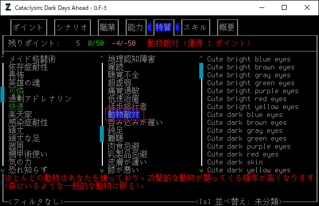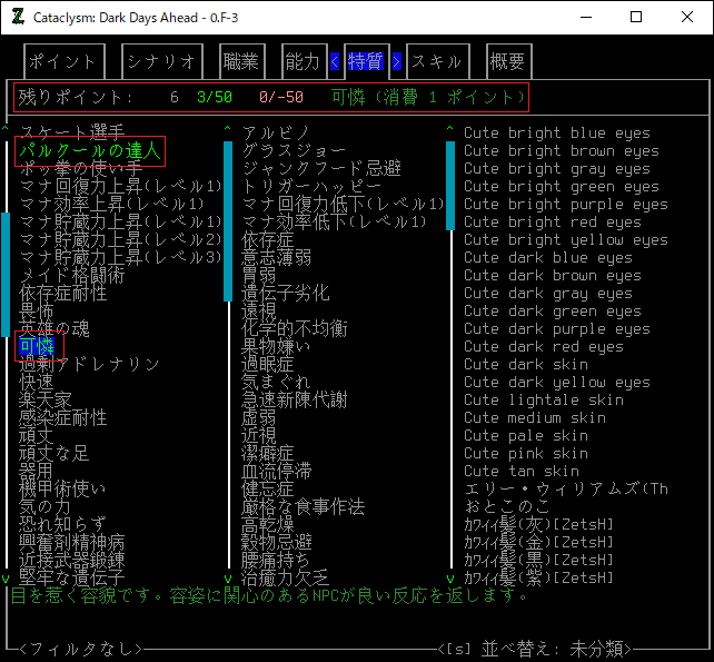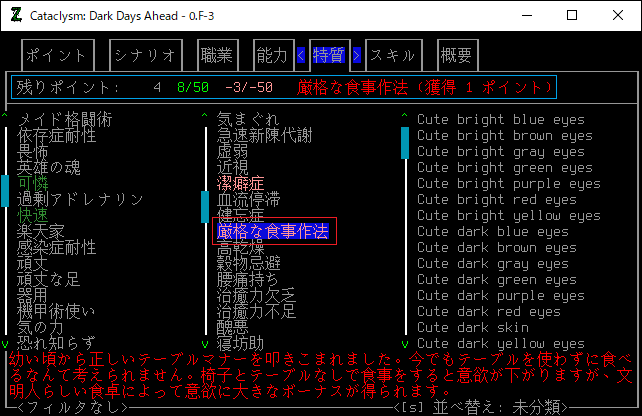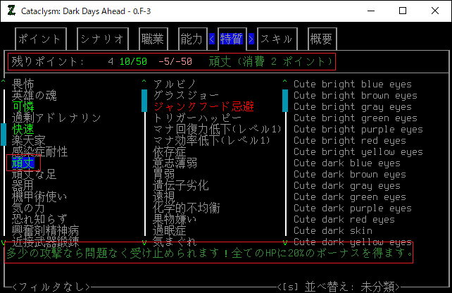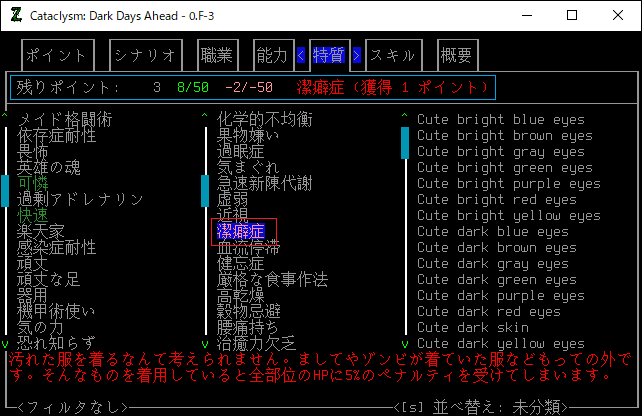 あくまでも0.Fでの話だが「潔癖症」は取り得らしい。汚れた服なんて最序盤しか着ないからだ。RP的にも楽しそうだし潔癖症はゲットだな。