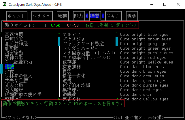 「俊敏」は常時10%のボーナスというぶっ壊れた性能の特質だ。まあ性能が優れているだけあって消費ポイントは3と多い。俊敏は必ず取得しておかないといけない。ぶっちゃけ武術は学習本から学べるしね。速度に影響する特質はこれで終わりかなあ。
