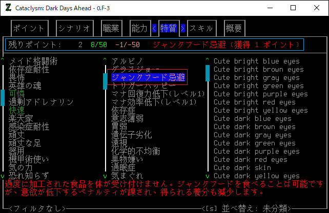 今のままではタロウ・タナカと同じ特質になってしまう。Magiclysmの才能が欲しいので、右側にあるポイントが増える特質を取得していきます。「ジャンクフード忌避」は毎回選んでいるから、もう取得したくない。たまにはジャンクフードを食べたいよ。しかし、ジャンクフード忌避の1ポイントで新たな特質を取得すればキャラクターの個性が激変するため、今回も取得しました。