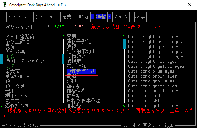 「急速新陳代謝」はスタミナが増えるし、役に立つこともあると溜まり場で見かけた。だけど初見だから躊躇してしまうなあ。0.F-3は食事が死に繋がるため保留にします。